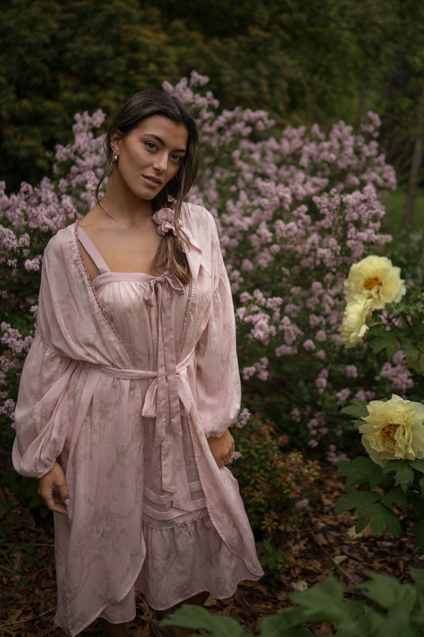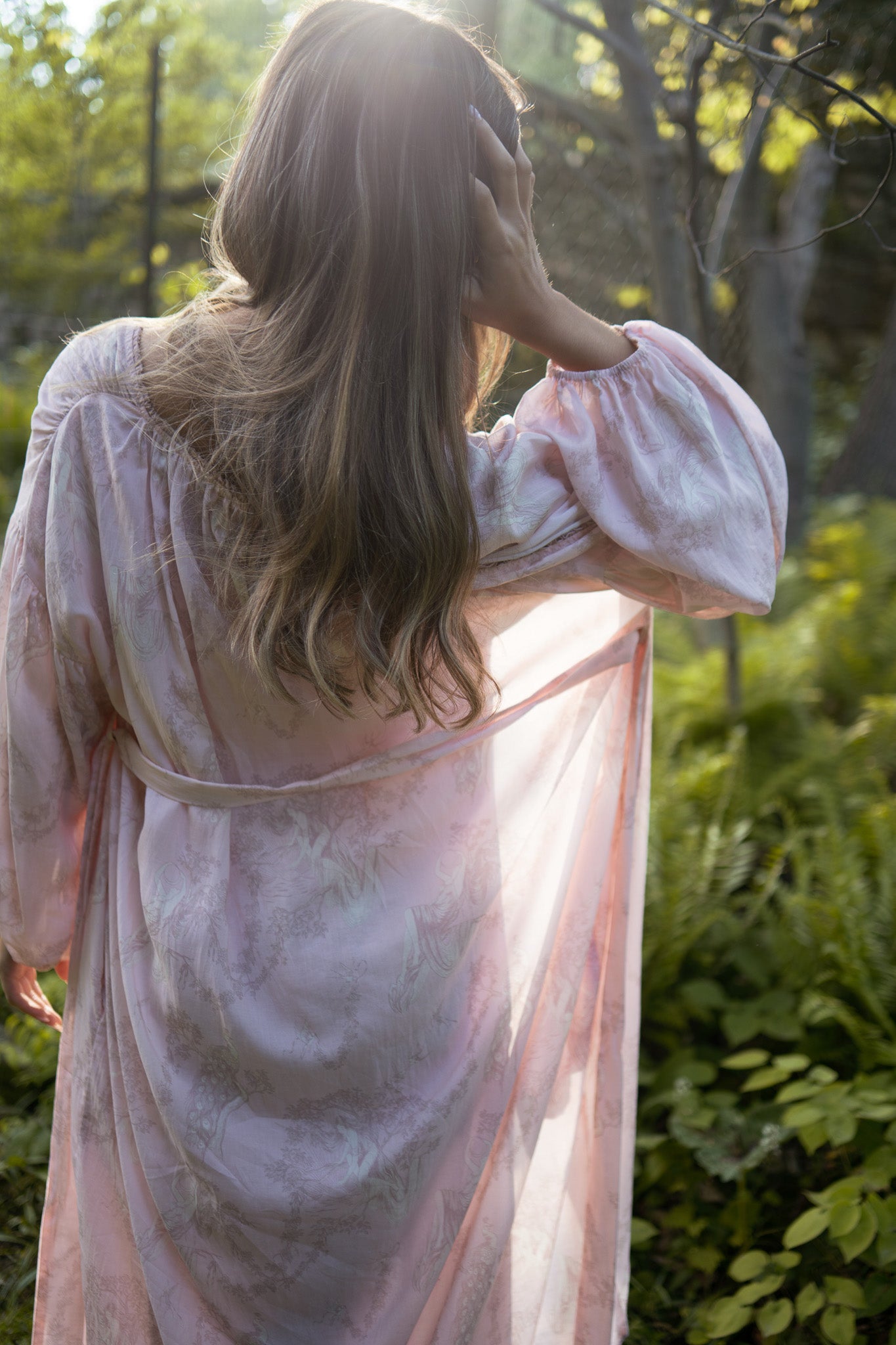 This loungewear/pyjama robe uses a romantic, vintage toile-inspired print featuring two muses influencing the sun and moon. Drawn in a technique inspired by vintage illustrations in antique hardcovers. Available in Petal Pink or Blue Gold.