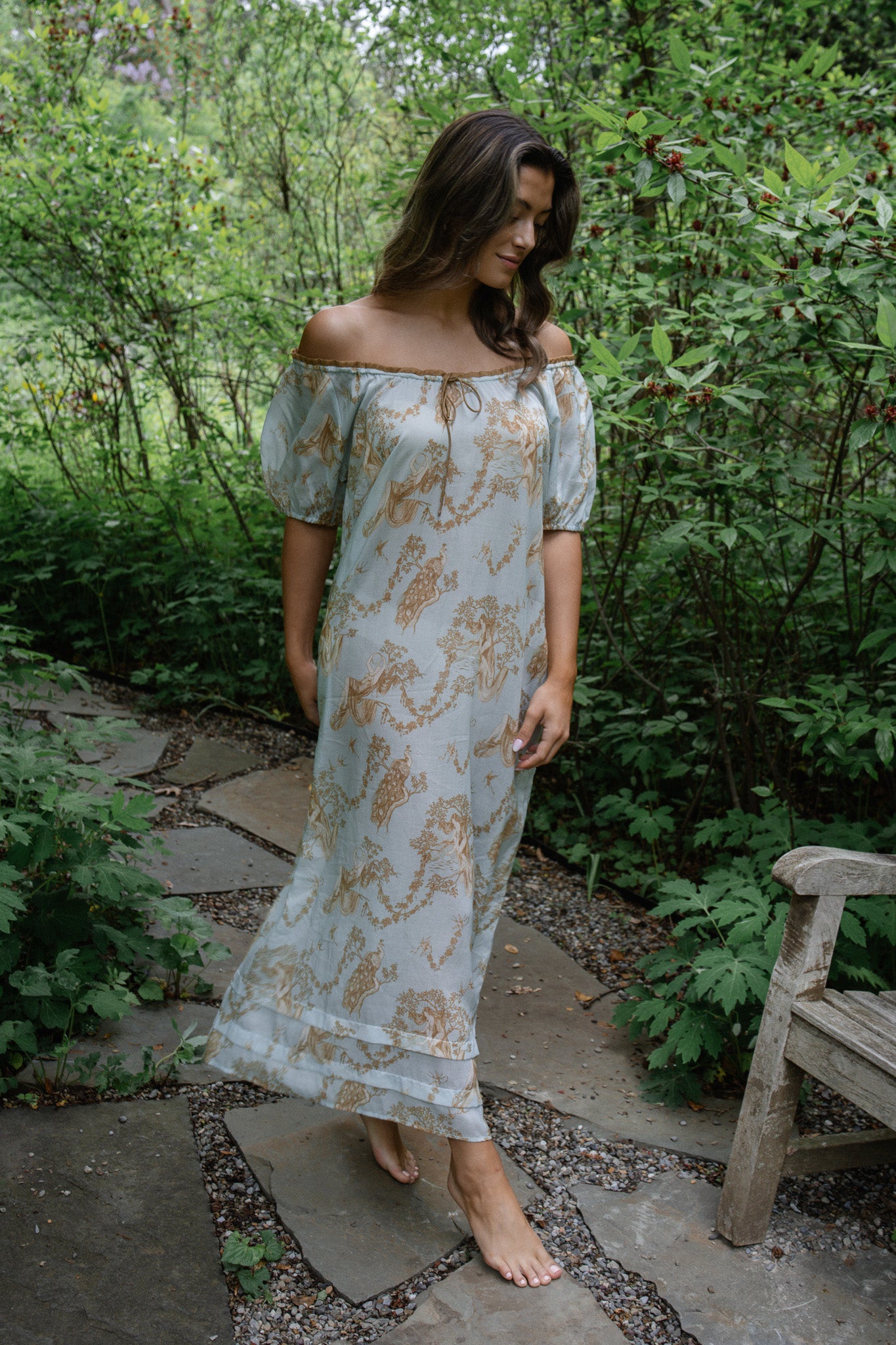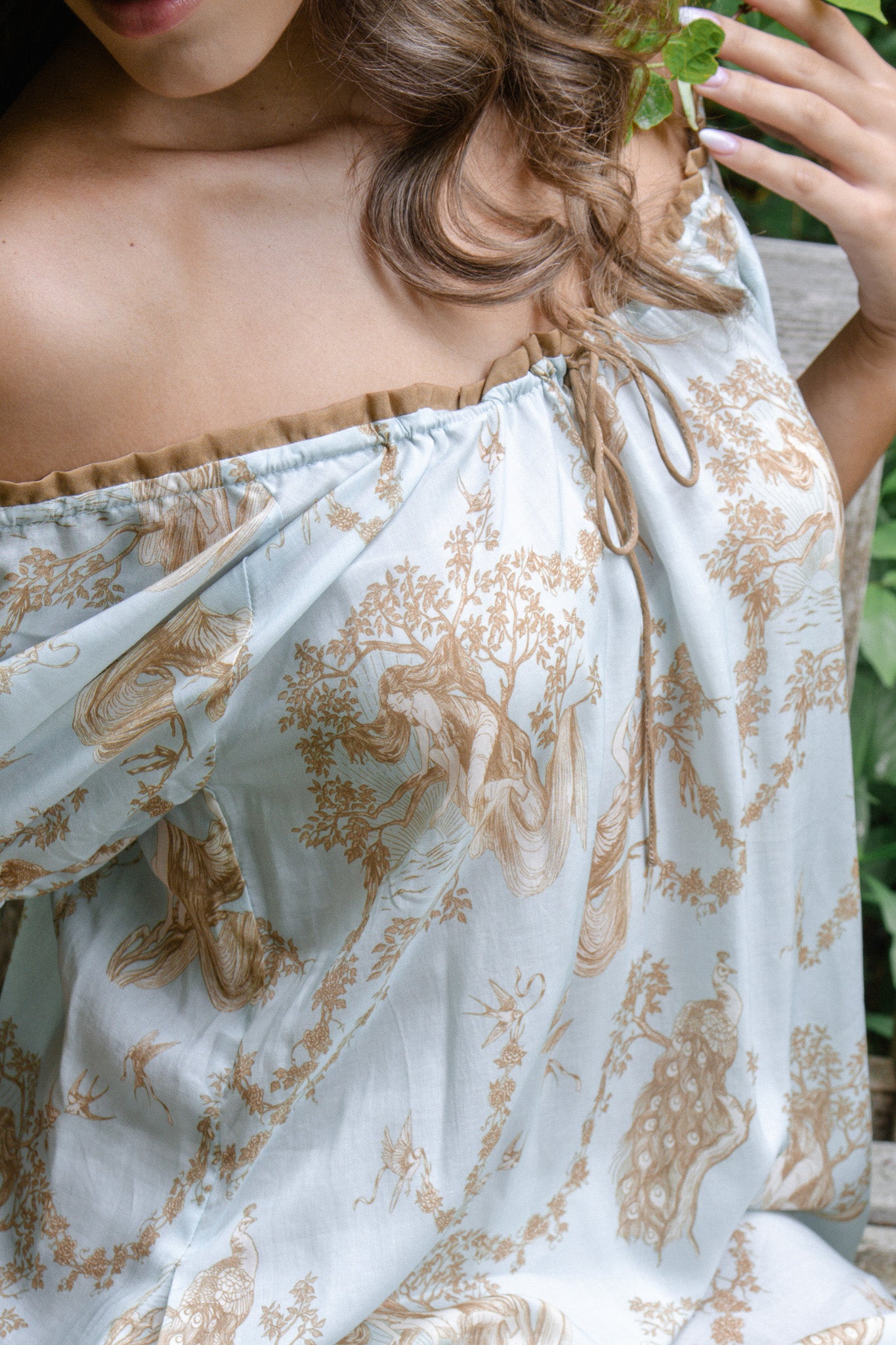This loungewear/pyjama nightgown uses a romantic, vintage toile-inspired print featuring two muses influencing the sun and moon. Drawn in a technique inspired by vintage illustrations in antique hardcovers. Available in Petal Pink or Blue Gold.