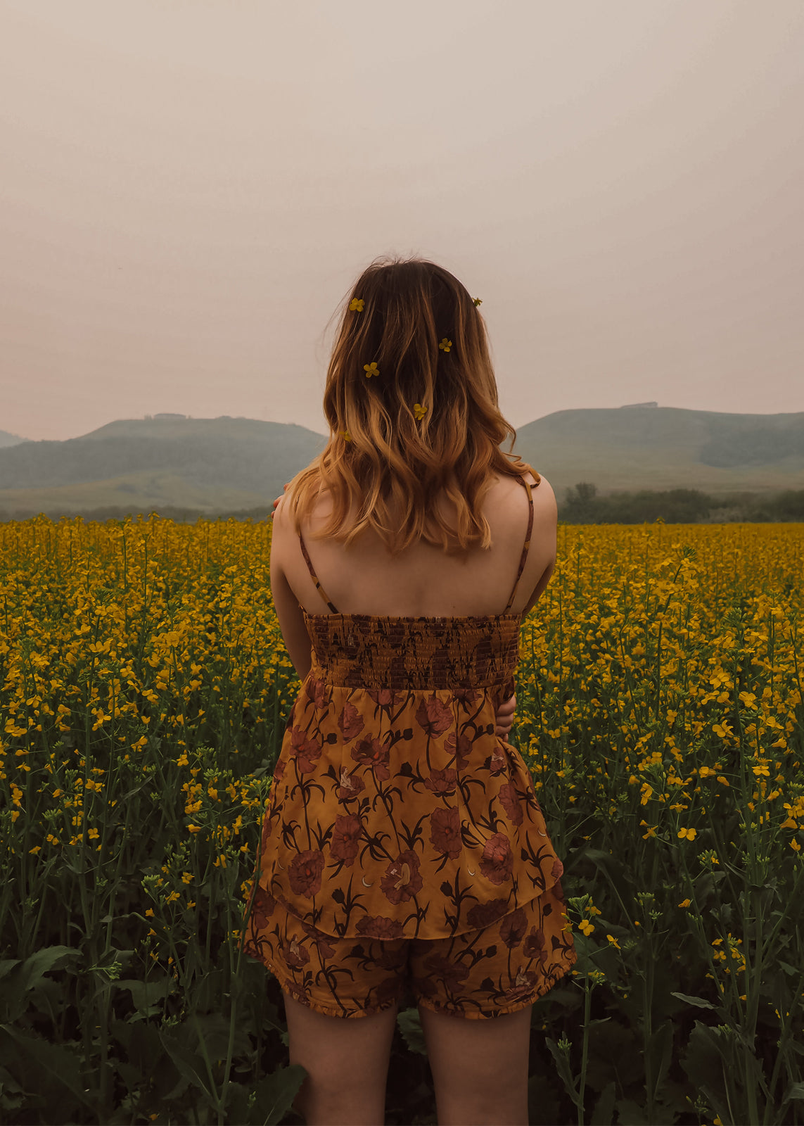 This loungewear/pyjama short uses a romantic, yellow and pink floral print featuring five women sleeping among the flowers and the moon drawn in a technique inspired by vintage illustrations in antique hardcovers.
