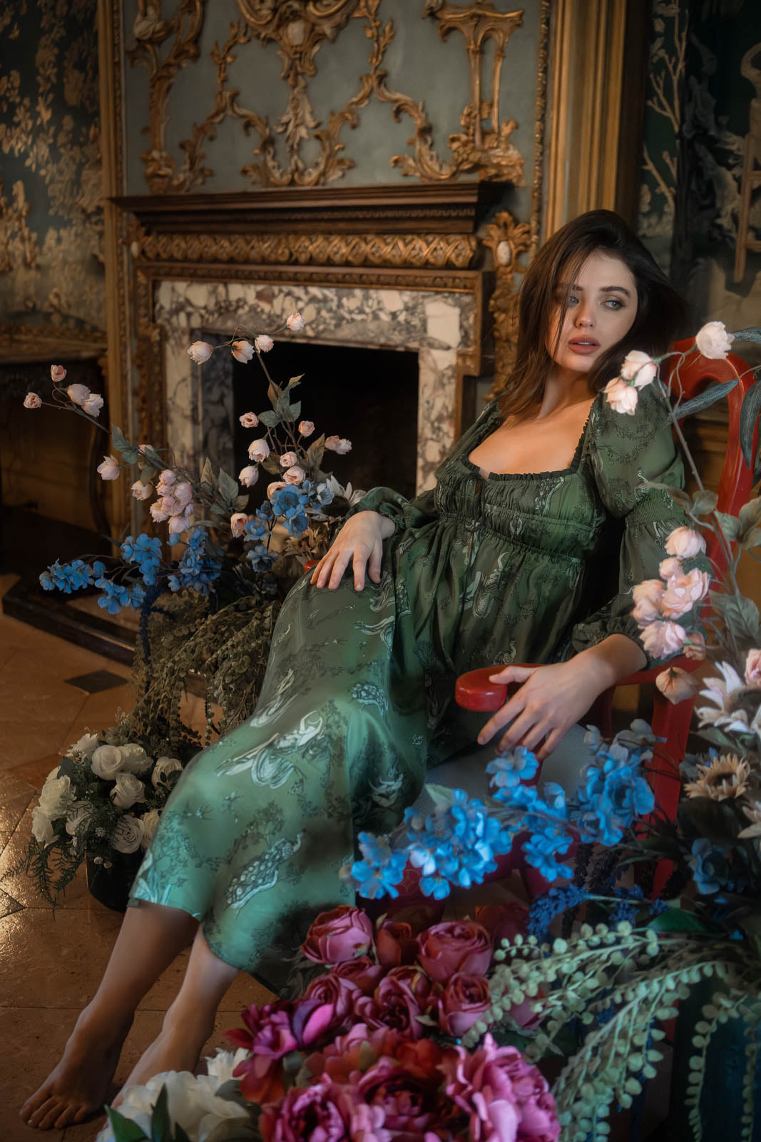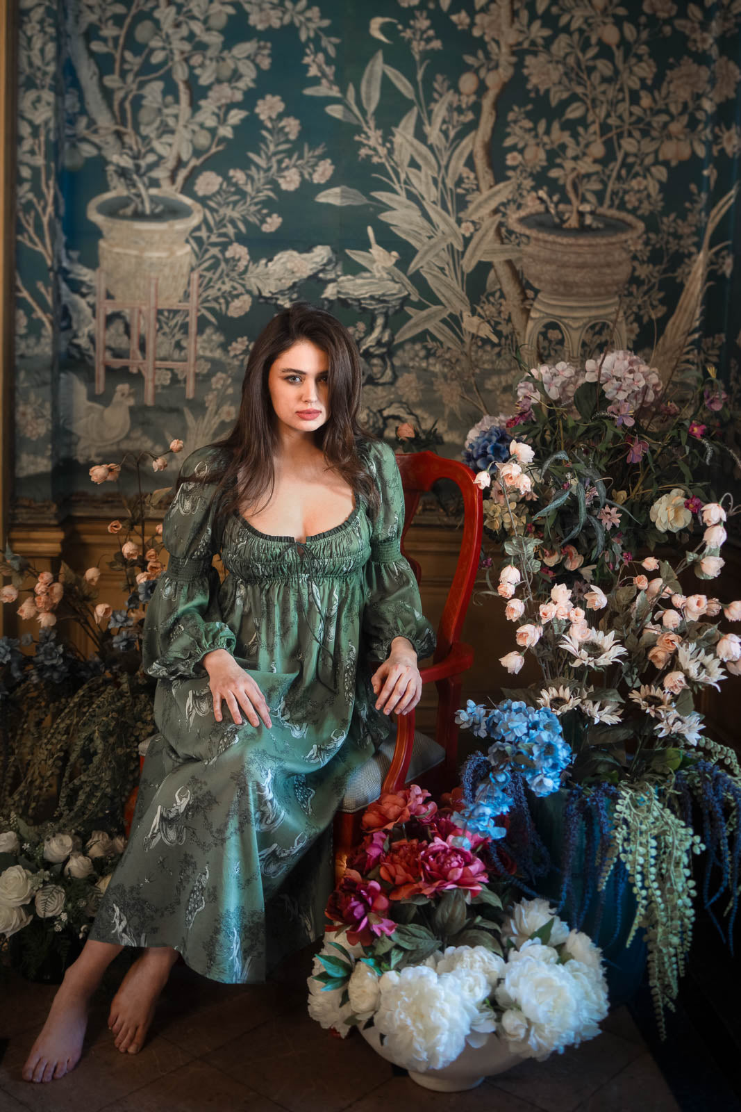 The Georgiana day dress / nightgown is crafted for the woman who dreams in soft light and lingers in the magic of quiet moments. Featuring a beautifully gathered bust (lined with cups!), delicate tie detail, and billowed sleeves that evoke centuries-old elegance.