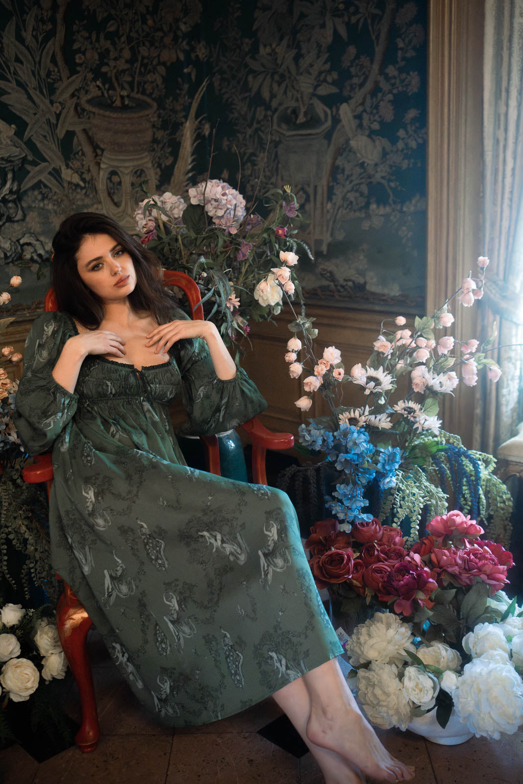 This day dress / nightgown uses a romantic, vintage toile-inspired print featuring two muses influencing the sun and moon. Drawn in a technique inspired by vintage illustrations in antique hardcovers. Available in Sage and Midnight Forest.