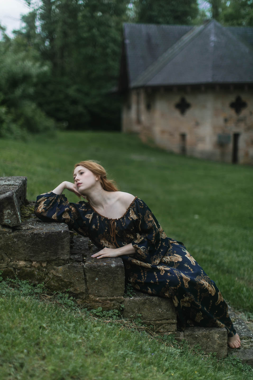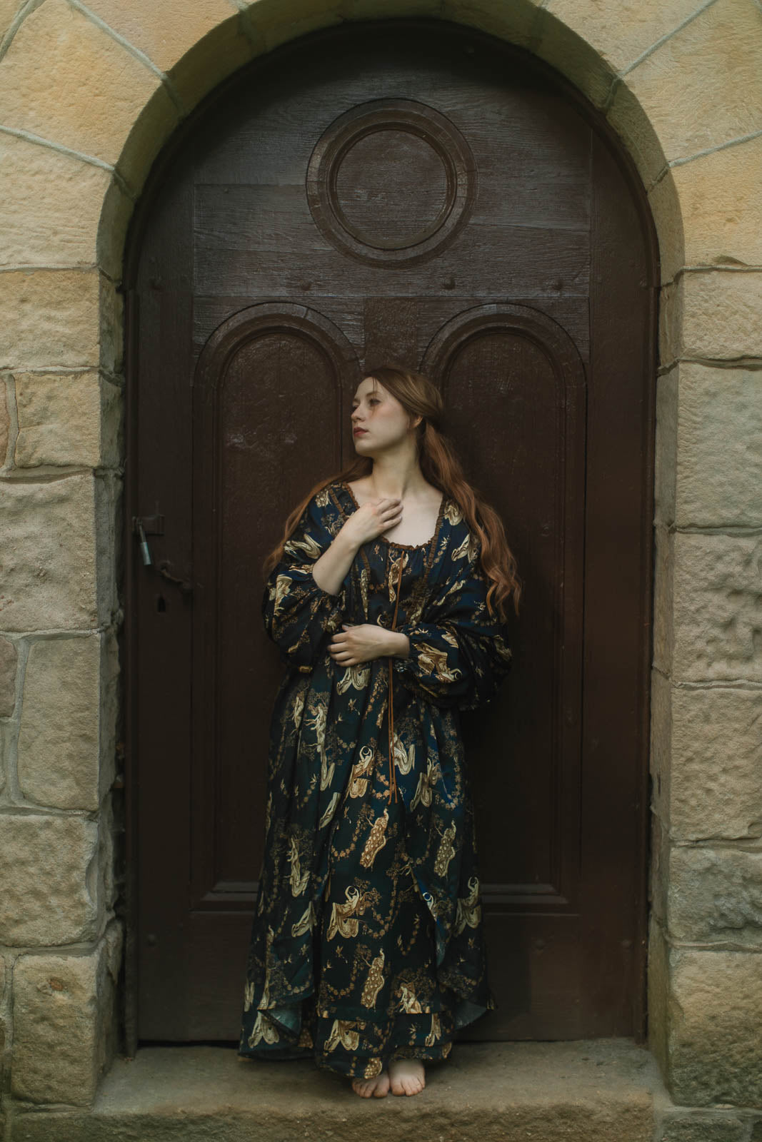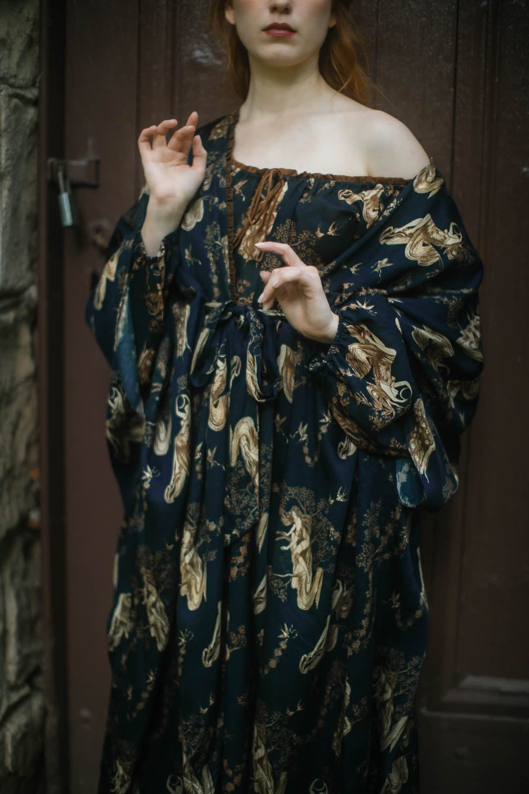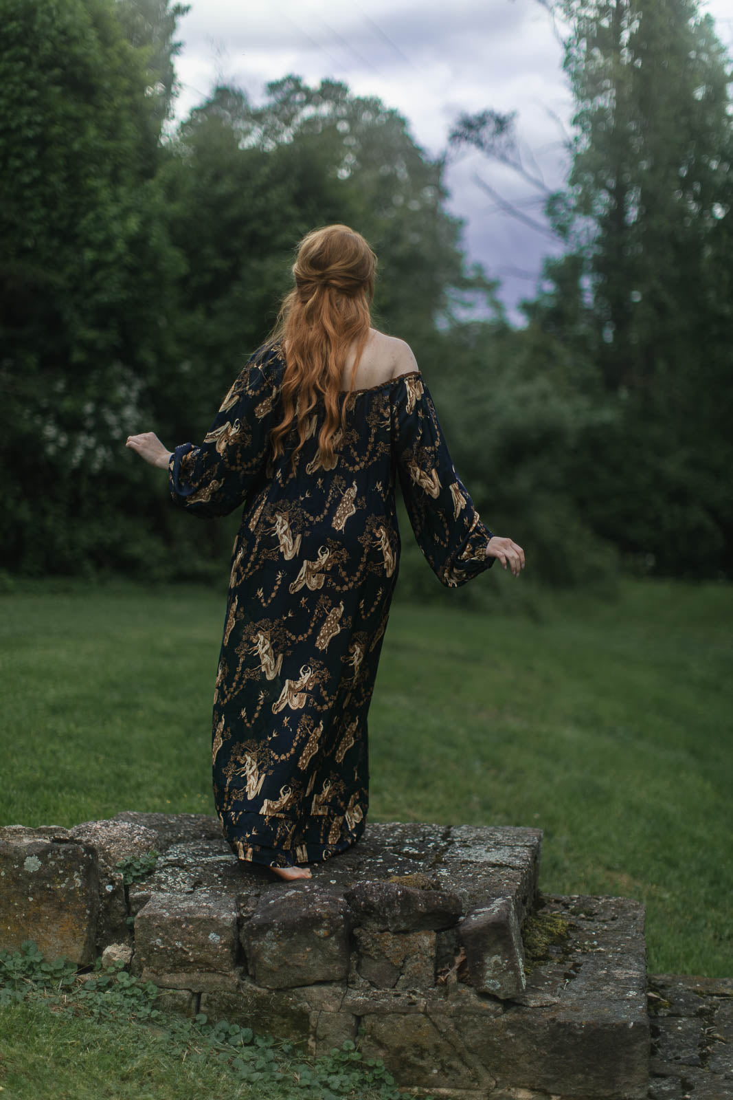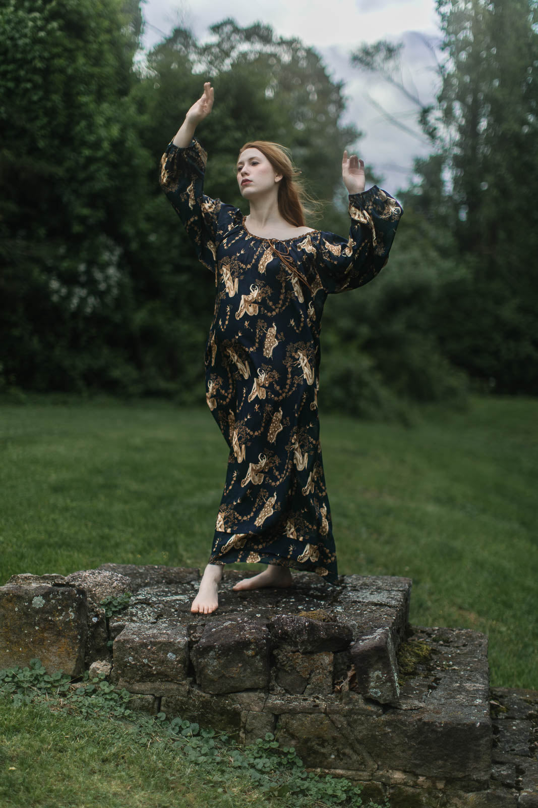 This loungewear/pyjama nightgown uses a romantic, vintage toile-inspired print featuring two muses influencing the sun and moon. Drawn in a technique inspired by vintage illustrations in antique hardcovers. Also vailable in Parchment and Sage.
