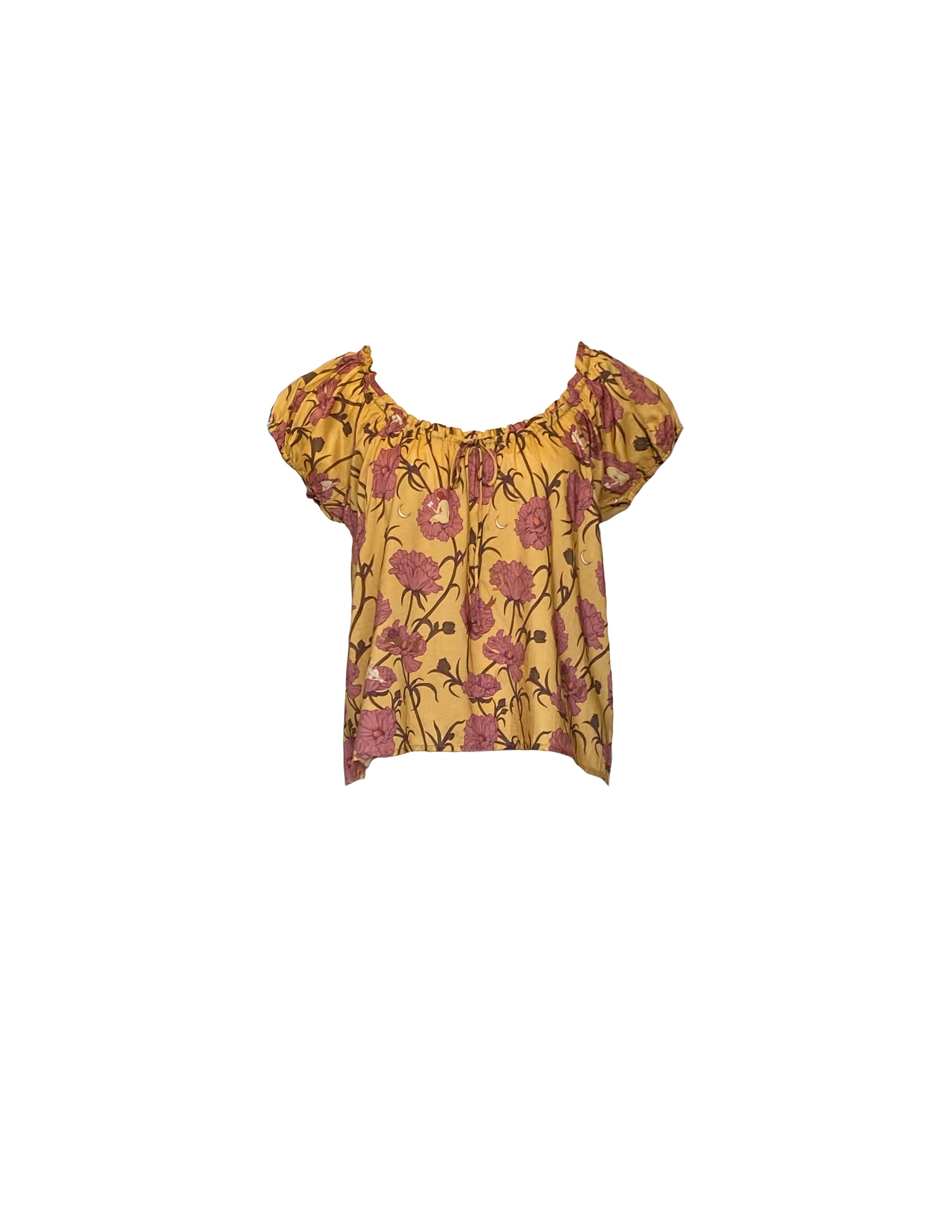 Short-sleeved blouson blouse with scooped drawstring neckline.