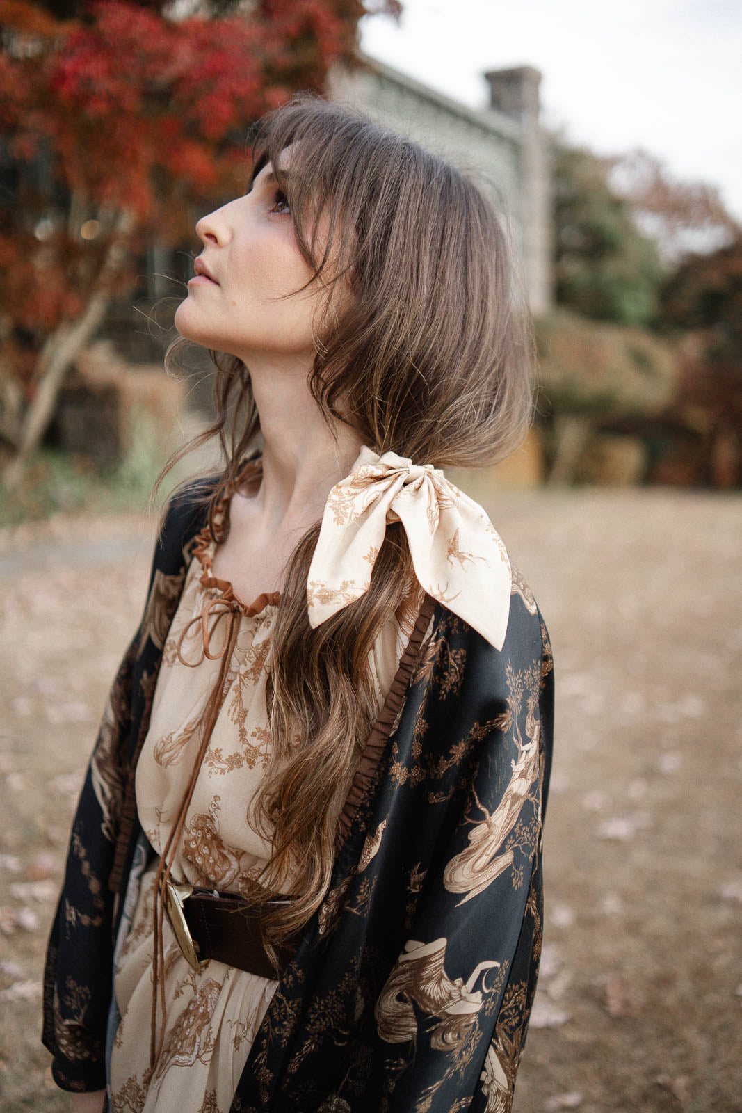 This scrunchie uses a romantic, vintage toile-inspired print featuring two muses influencing the sun and moon. Drawn in a technique inspired by vintage illustrations in antique hardcovers. Available in Petal Pink, Blue Gold, Parchment and Sage.