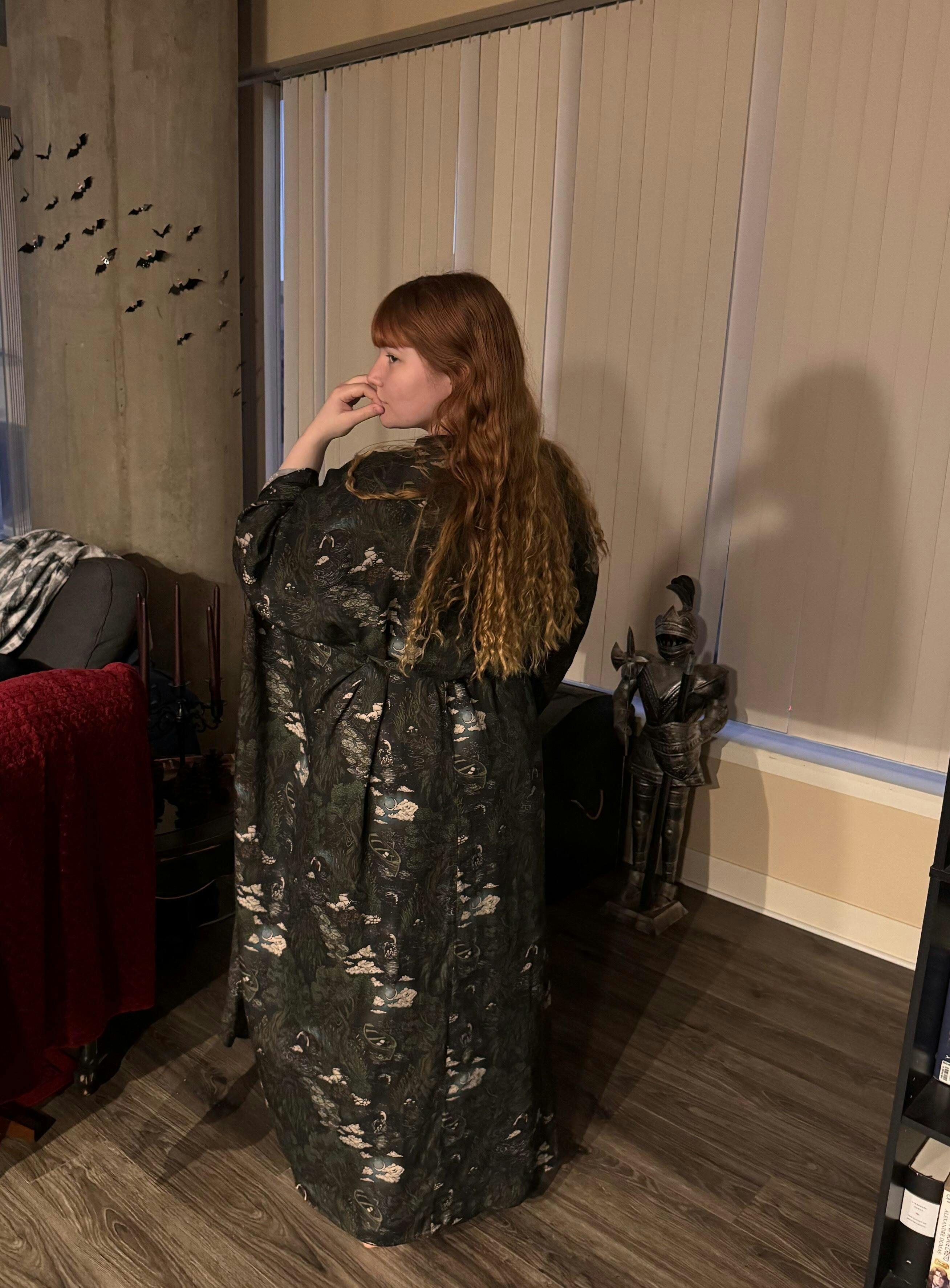 First let me just say, this is my favorite robe I've ever owned. The pattern is beautiful, the material is a soft and breathable cotton-like material(perfect for me since I despise silky satin type robes), and the cut is quite flattering. Somewhere between a kimono and a Victorian dressing gown.